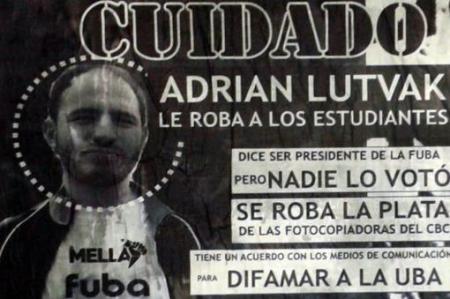 El presidente de la Federación Universitaria de Buenos Aires, Adrián Lutvak, denunció la aparición de afiches anónimos con su imagen, nombre y apellido, en los que se lo acusa de usurpar su cargo y de tener un pacto con los medios para difamar a la UBA. Desde ayer se realiza el Congreso de la entidad, que hoy debe revalidar el mandato de sus autoridades. Por Mailén González Buenos Aires, 20 de mayo de 2015. Este viernes se realizará la sesión final del Congreso de la FUBA para renovar sus autoridades como cada año. Pero la política interna de la mayor universidad argentina no está tranquila. Señal de eso fueron afiches aparecidos el miércoles, acusando al actual secretario Lutvak de usurpar su cargo. Los afiches anónimos, que aparecieron en la Plaza Houssay y en las inmediaciones de Ciudad Universitaria y de las facultades de Ingeniería, Psicología y Sociales, aseguran también que el dirigente “se roba la plata de las fotocopiadoras del CBC”.