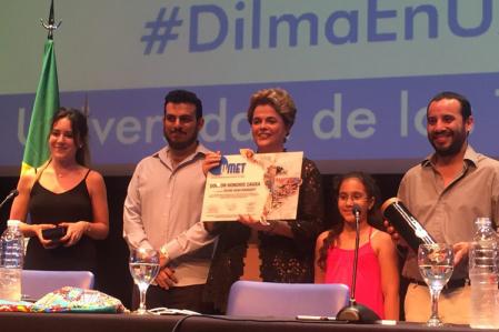 La presidenta electa de Brasil, Dilma Rousseff, llegó a la Argentina para dar una charla magistral en la que habló de democracia, derechos y justicia social. Fue en la UMET, donde pusieron pantallas en la calle para el seguimiento de la conferencia que se realizó en el anfiteatro, con cupo limitado. Dilma dijo que en Brasil está en marcha un "golpe dentro del golpe". Por Mailén González Buenos Aires, 23 de diciembre de 2016. La ex presidenta Dilma Rousseff afirmó que el mandatario Michel Temer "ha sufrido presiones para renunciar, es público y notorio que ha sido acusado" de corrupción, y si dimitiera luego del 1° de enero próximo se tratará de "un golpe dentro del golpe”, porque a partir de entonces le corresponderá al Congreso elegir a su sucesor.