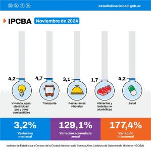 La inflación en la Ciudad de Buenos Aires fue del 3,2% en noviembre y acumula 177,4% en el último año. El índice registrado es igual al que se había producido en octubre, según informó la Dirección de Estadística de la Ciudad de Buenos Aires. El dato pone un punto de atención sobre el resultado nacional ya que mostró que los precios no lograron quebrar el piso que habían tocado el mes anterior, utilizando un método de registro más actualizado que el INDEC. Por Mateo Salvo Buenos Aires, 13 de diciembre de 2024. La inflación en la Ciudad Autónoma de Buenos Aires se mantuvo en el 3,2% durante noviembre, replicando el porcentaje registrado el mes anterior, según informó el Instituto de Estadística y Censos porteño (IPCBA). El principal rubro que explica el número final fueron los ajustes de tarifas.